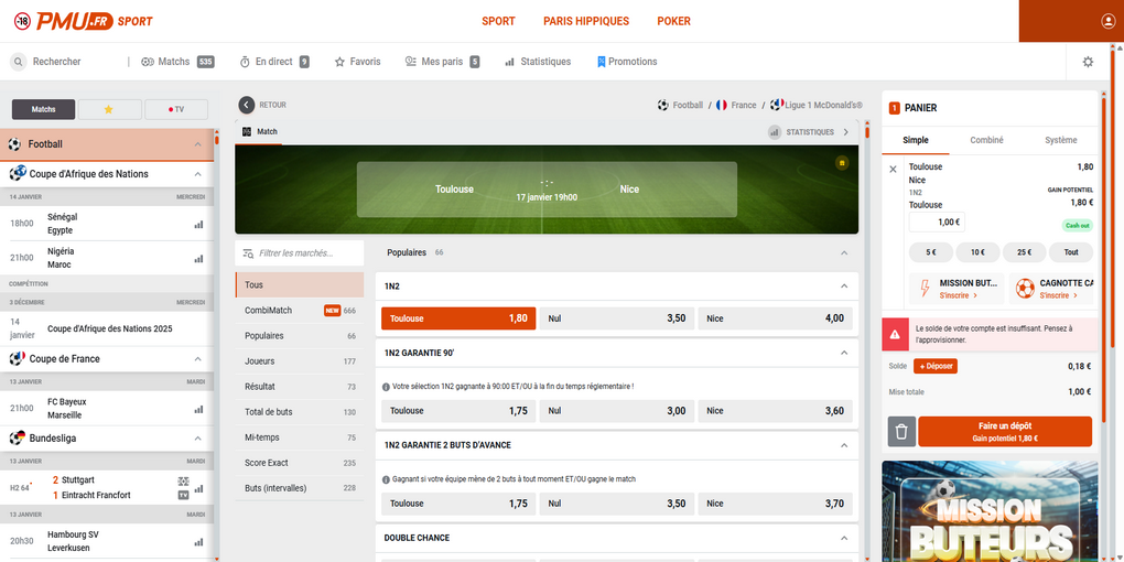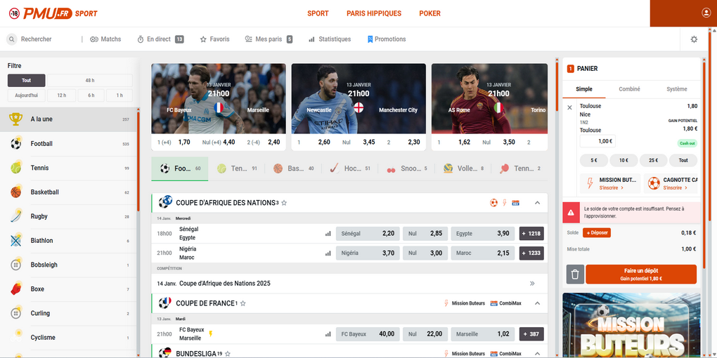 PMU Sport est la plateforme de paris sportifs en ligne du Pari Mutuel Urbain (PMU), l’un des plus anciens opérateurs de jeux en France. PMU a élargi son offre historique de paris hippiques pour proposer des paris sur tous les sports autorisés en ligne (football, tennis, rugby, basket, etc.), PMU Sport est accessible depuis un navigateur ou depuis l'application mobile. La plateforme permet de : Parier avant match et en direct sur une grande variété de compétitions avec le live-betting. Suivre des matchs ou événements sportifs en streaming pour suivre ses paris en temps réel. Tous les types de paris sont disponibles sur PMU Sport : pari simple, pari combiné, pari système, ainsi que de nombreux marchés disponibles sur chaque évènement. Profitez de cotes compétitives et de promotions régulières pour les parieurs.