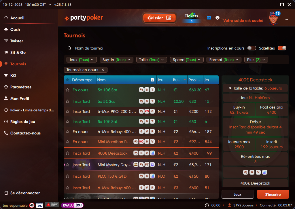 Jouez les tournois de poker freeroll sur PartyPoker. PartyPoker offre chaque jour des tournois freeroll avec des dotations en tickets €. PartyPoker partage son réseau iPoker avec Bwin Poker et PMU Poker. Pour les nouveaux joueurs : profitez du bonus de 100% jusqu'à 250€ sur votre premier dépôt. Sur PartyPoker, votre statut VIP vous donne accès à 2 freerolls exclusifs : le Daily Freeroll 100T€ chaque jour à 19h et le Weekly Freeroll 1000T€ chaque dimanche à 19h. Pour devenir VIP, vous devez cumulez des points aux tables de poker en jouant sur PartyPoker.