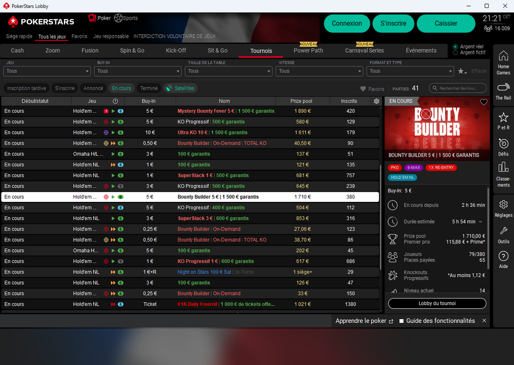 PokerStars est l’une des plus grandes rooms de poker en ligne au monde et sponsorise de nombreux joueurs professionnels renommés. Qualifiez-vous sur les satellites quotidiens gratuit pour le Star Freeroll 500T€ du mercredi et le Star Freeroll 1500€ du dimanche. A l'inscription, 10 tickets tournois sont offerts dont 4 Freerolls Bienvenue 1000€. PokerStars organise chaque semaine de nombreux MTT ainsi que les célèbres tournois du dimanche (Le Classico, Sunday Special, Sunday Supersonic) qui attirent des milliers de participants. PokerStars propose aussi les Spin & Go, des Sit and Go Jackpot à 3 joueurs où les gains sont déterminés aléatoirement avant le coup d’envoi. La plateforme permet aussi de se qualifier pour les plus grands événements live comme l’European Poker Tour (EPT) et les World Series of Poker (WSOP), donnant la chance de jouer aux côtés des plus grands champions.
